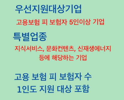 • 기업 요건: 상시 근로자 5인 이상인 우선 지원 대상기업, 특별 업종에 해당하는 기업