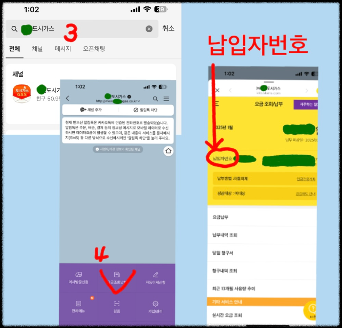 아래 이미지에서 번호순으로 따라 하시면 납입자 번호를 알수 있습니다.